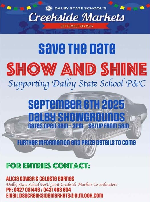 Proudly supporting Dalby State School P&C, this event is a must-see for car lovers, families, and market-goers alike. Whether you’re entering your pride and joy or just coming along to admire the view, it’s a day not to be missed! ![]()